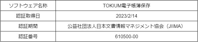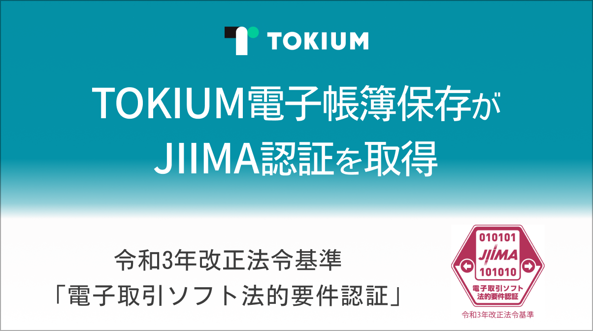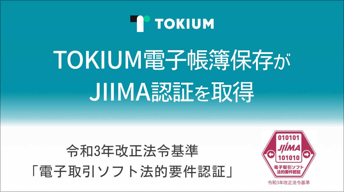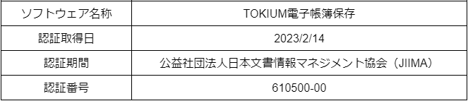 株式会社TOKIUM(本社:東京都千代田区、代表取締役:黒﨑 賢一、以下 当社)は、文書管理クラウド「TOKIUM電子帳簿保存」が、公益社団法人 日本文書情報マネジメント協会(以下 JIIMA)が認証する「 電子取引ソフト法的要件認証」を取得したことをお知らせします。