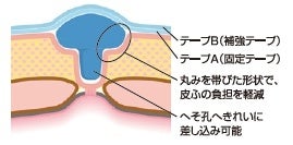 本製品は、医師の指導のもと乳児臍ヘルニアの圧迫療法に使用します。やわらかくてつぶれにくい特殊形状の圧迫材と、2種類の異なる特長を持ったテープをセットにした専用品です。肌に優しいフィルムドレッシング(カテリープラス(TM))および粘着力が強く伸びないテープを組み合わせることで、皮膚へのやさしさと高い固定力を両立し、確実な圧迫を行うことができます。