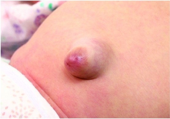 臍(さい)ヘルニアは、乳児のおへその皮膚が腸壁から突出し、その中に腸などの臓器が飛び出している状態で、おへそが身体の外に膨らむ形になるのが特徴です。新生児約10人に1人の割合で、低出生体重児ではさらに高い割合で発生します。臍ヘルニアの症状は治療をしなくても1年で80%、2年で90%が自然に治るといわれていますが、治療を行わなかった場合は整容面で家族が希望するおへその形との間に差ができる場合があります。臍ヘルニアの治療には、おへそに綿球やスポンジ、専用品などを押し当てテープで固定する「圧迫療法」が行われています。