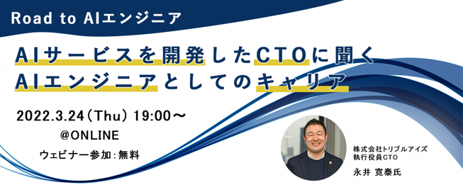 本ウェビナーでは、従業員のうち77%がITエンジニアというデジタルトランスフォーメーション(DX)のリーディングカンパニーである株式会社トリプルアイズ 執行役員CTO永井氏を講師にお迎えし、実際のAIサービスの開発実例を通じて「AIの開発現場を知る」「AIエンジニアへのキャリアを知る」の2点をテーマにお話いただきます。
