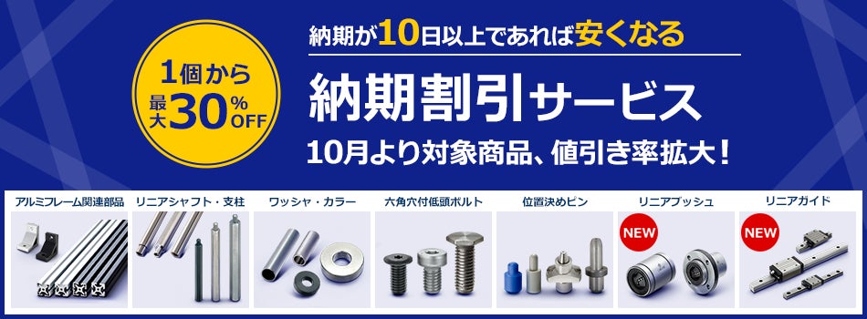 アルミフレーム関連部品全般、シャフト、支柱、ワッシャ、カラー、六角穴付低頭ボルト、位置決めピンに加え、10月より、リニアガイド、リニブッシュが新たに対象となりました。さらに順次対象を拡大予定です。