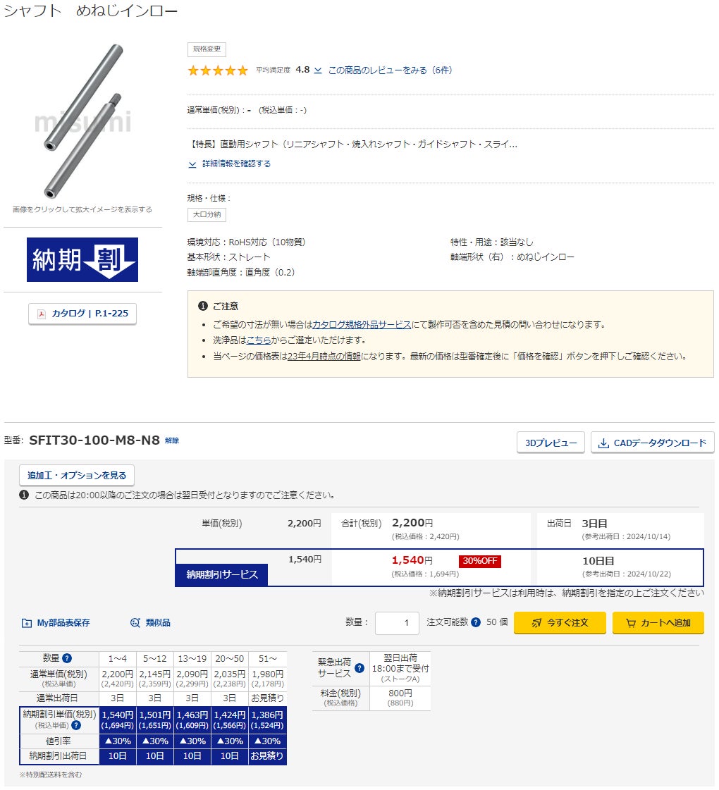 ▼ 納期割引サービス適用時の価格・納期の確認方法(MISUMI ECサイト画面イメージ)