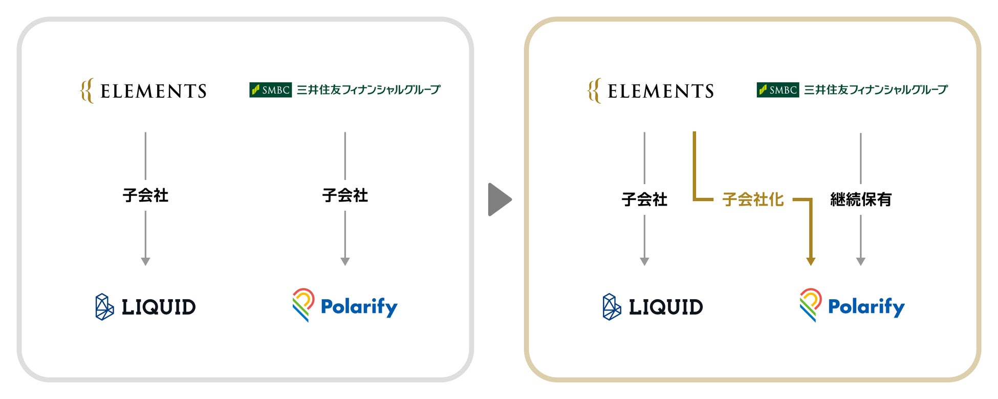 生体認証や画像認識サービスを展開する株式会社ELEMENTS(本社:東京都中央区、代表取締役社長:長谷川 敬起、以下「ELEMENTS」)は、2025年1月14日開催の取締役会において、株式会社三井住友フィナンシャルグループ(本社:東京都千代田区、執行役社長グループ CEO:中島 達、以下「SMBCグループ」)の株式会社ポラリファイ(本社:東京都港区、代表取締役:和田 友宏、以下「ポラリファイ」)の株式を取得し、連結子会社化することについて決議したことをお知らせします。SMBCグループは、引き続きポラリファイ株を保有します。