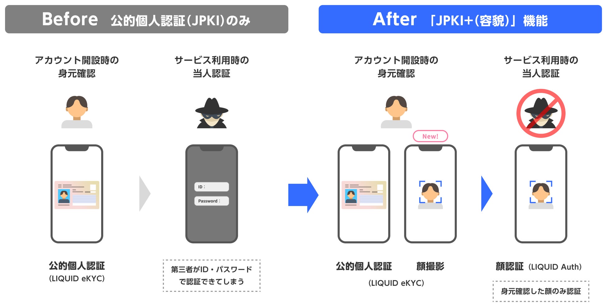 厳格な本人確認(身元確認)に加えて、顔認証でアカウントや口座開設者と実際の利用者の同一性を確認することで、利用者アカウントと利用者のスマホを正しく紐づけるバインディングを行い、なりすましを防止します。万が一、フィッシングなどの詐欺でIDやパスワード、ワンタイムパスワードなどが詐取されても、不正者は取引できないようにします。また、通常の公的個人認証(JPKI)における本人確認は、顔撮影のフローがありません。「LIQUID eKYC」では、公的個人認証による本人確認(身元確認)時に顔容貌を撮影し、サービス利用時の当人性を顔認証で確認可能にする「JPKI+(容貌)」機能を搭載し、バインディングによる不正対策をできるようにしています。