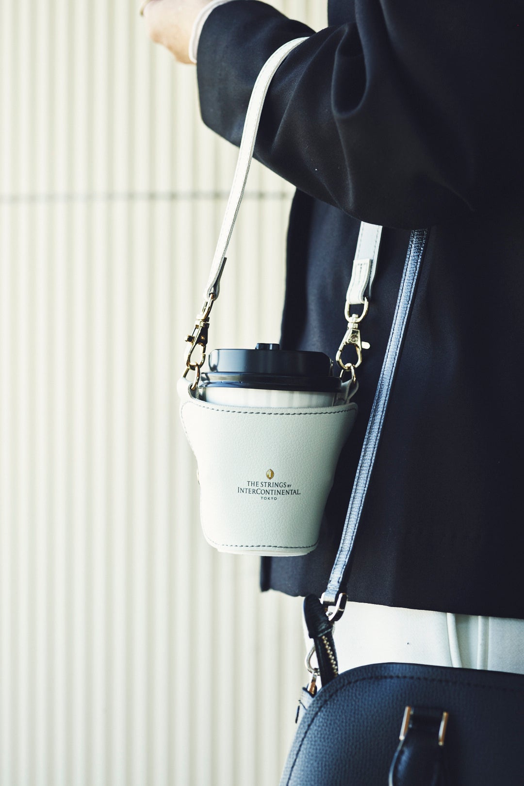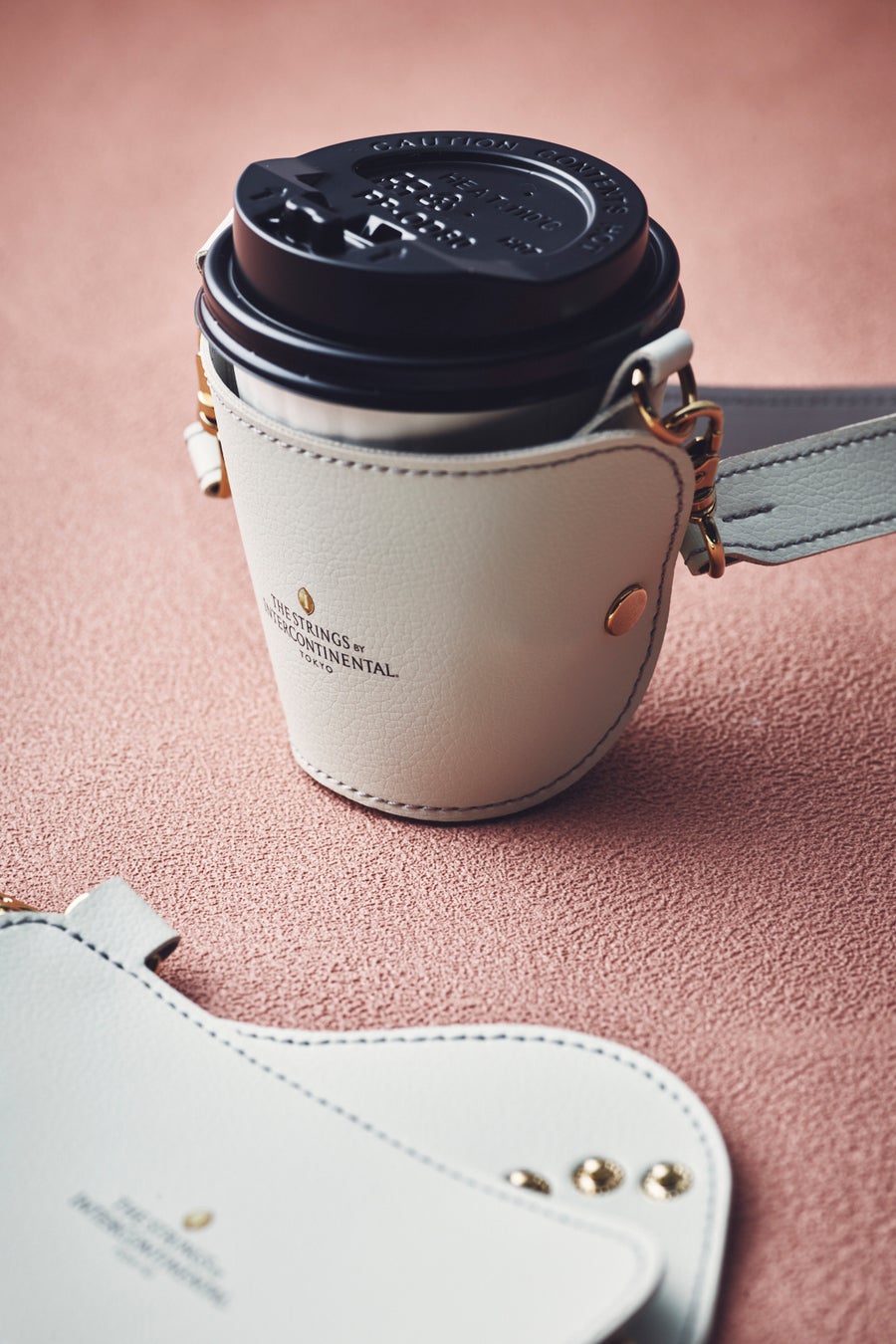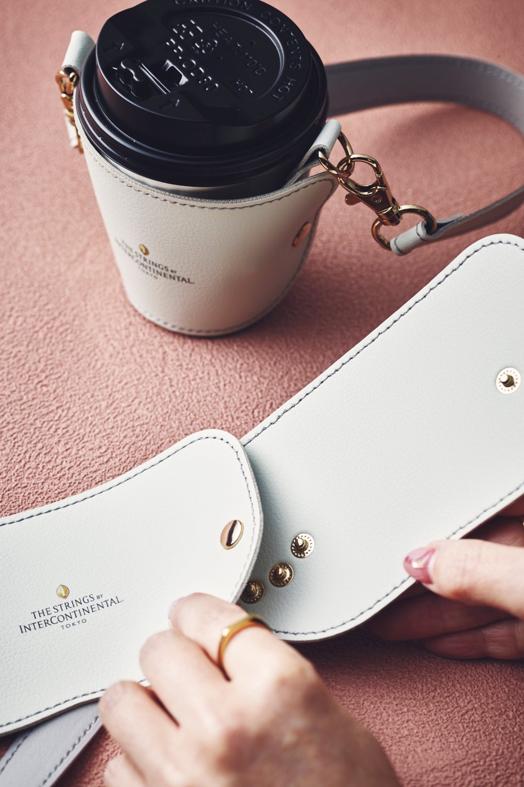 20周年を記念してテイクアウトコーヒー&ティーに便利につかえるカップホルダーをオリジナルで製作しました。レザー仕様のホルダーは繰り返し使用でき紙ごみ削減に貢献します。ホルダーはボタンが3つ、サイズにあわせて大きさを調整できS、M、Lいずれのサイズでも対応可能です。取っ手があるので両手が空き使い勝手バツグン!使わないときはチャームとしてまたはコンパクトに平たくたたんでバックの中に。環境への配慮とおしゃれが両立するストリングスロゴ入りカップホルダーは、アートディナー付きステイプランで宿泊の皆さまにプレゼントいたします。