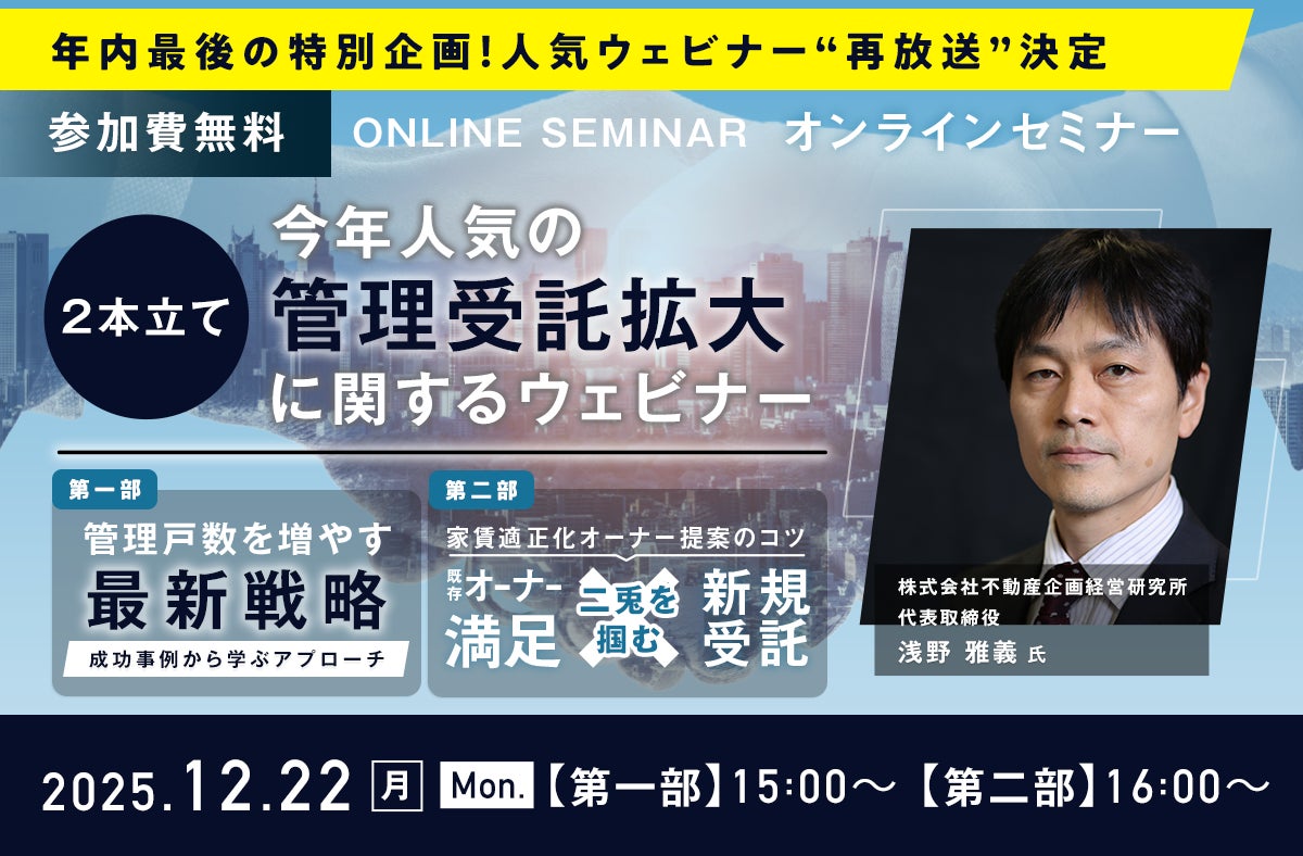 本ウェビナーでは、今年多くの不動産会社様からご好評いただいた「管理戸数を増やす最新戦略(2025年2月開催)」と「家賃適正化オーナー提案のコツ(2025年10月開催)」の2つの人気テーマを、“年末特別企画”として 1日で学べる総集編形式でわかりやすく解説します。