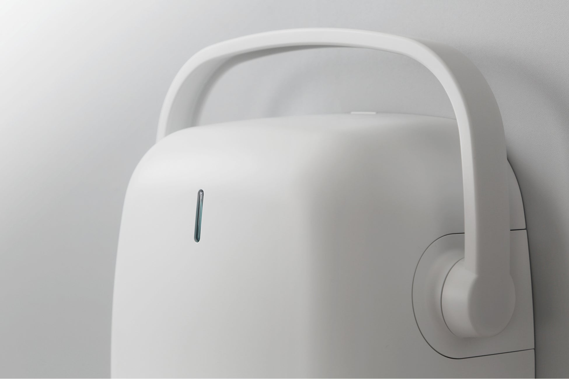 通常のシャワーモードと泡モードの切り替えは、本体のハンドルを上下させるだけで、操作が簡単なユニバーサルデザインになっています。コンプレッサー内蔵一体型のすっきりとした見た目で、本体には残量インジケーターが付いているため、専用ボディソープの補充タイミングも分かりやすくなっています。