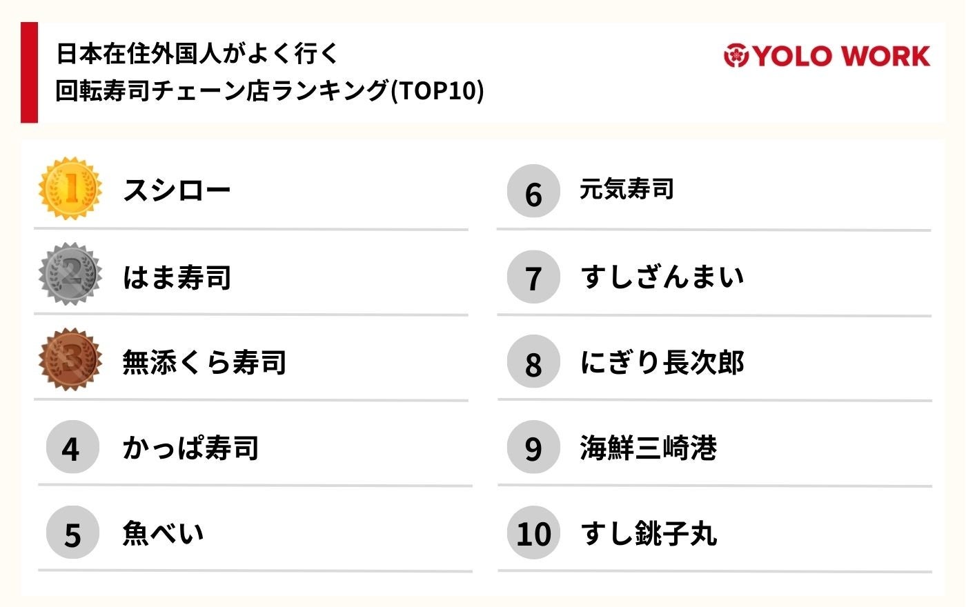 https://www.yolo-work.com/13552から「外国人がよく行く回転寿司チェーン店ランキング」の詳細をご覧いただけます。
