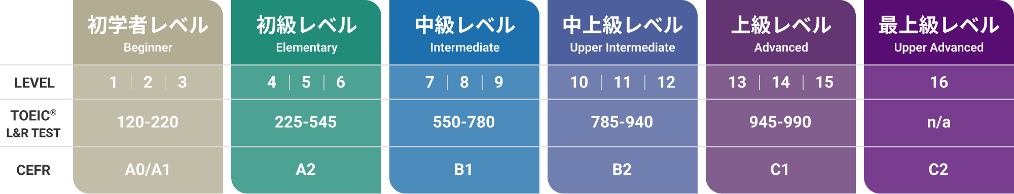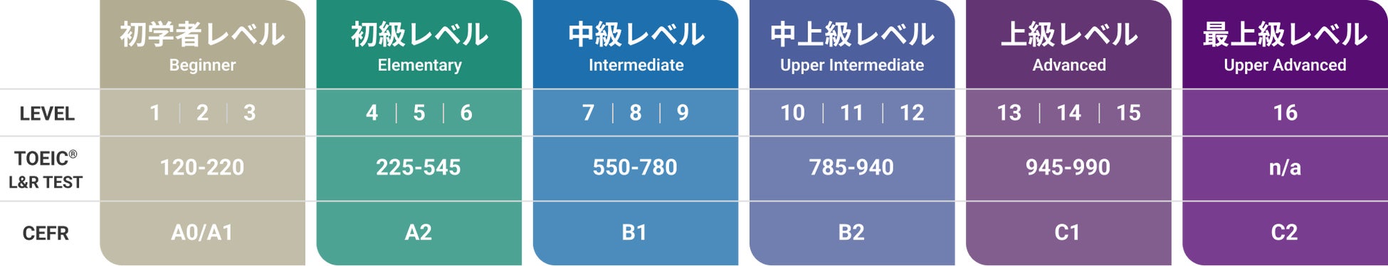 ※CEFRとはCommon European Framework of Reference for Languages(ヨーロッパ言語共通参照枠)の略。複数言語が使用されるヨーロッパにおいて、言語能力の共通参照枠として開発されました。現在ではヨーロッパに限らず、広く世界中で外国語教育における指標として活用されています