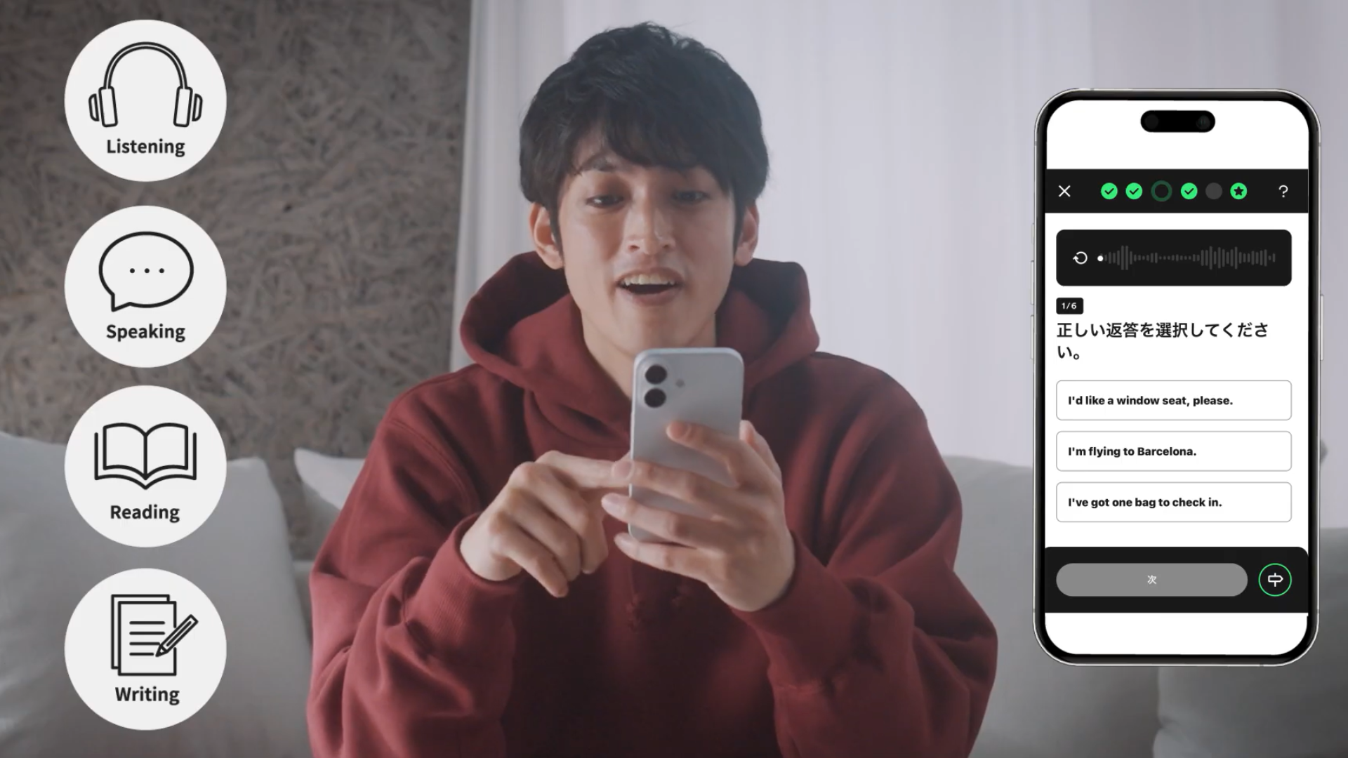 国際基準の言語能力指標「CEFR」を採用し、A1(初心者)からC2(最上級)までをより細分化した全16段階のレベルを設定しています。各レベル修了時には進捗テストを経て修了証明書が発行され、TOEIC® L&R TESTなどの主要試験との相関も明確なため、成果を客観的に可視化できます。