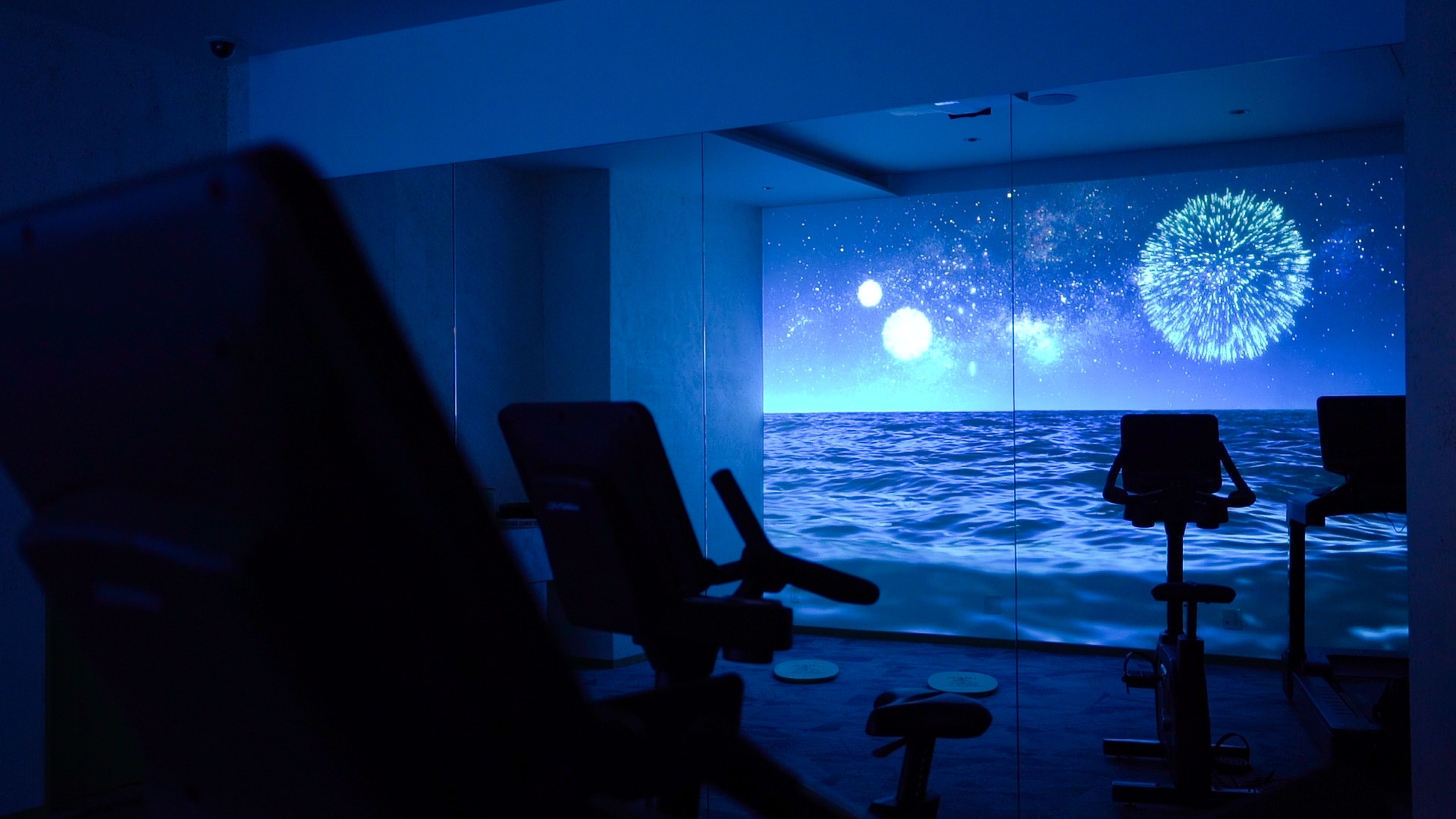 沖縄の雄大な海をイメージした映像をプロジェクションマッピングし、没入感のある空間を演出。ヨガやトレッドミルに加え、バランスボードを使ったサーフィンの疑似体験も楽しめます。映像は時間帯に応じて変化し、イルカが跳ねる演出や夜の花火など、飽きることなく特別なフィットネス体験を提供します。