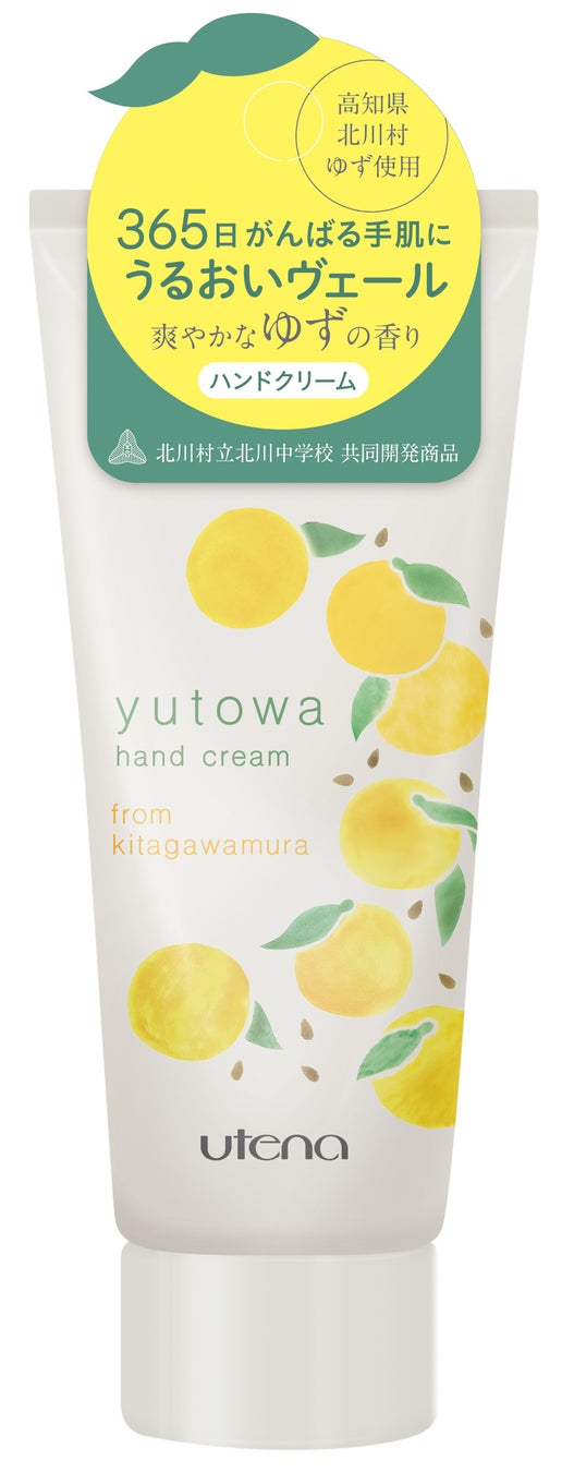 ゆず産業の活性化の一環として、2023年11月1日に北川村ゆずを使った「ユトワ ハンドクリーム」を発売いたしました。「北川村のゆずを全国の人に知ってもらいたい」という北川村立北川中学校の生徒と協力し、化粧品メーカーのウテナが商品開発を、ドラッグストアのウエルシアが販売をサポートして共同開発した商品です。商品を通して全国の人に北川村ゆずの魅力を伝えることで、過疎に悩む北川村を盛り上げていきます。