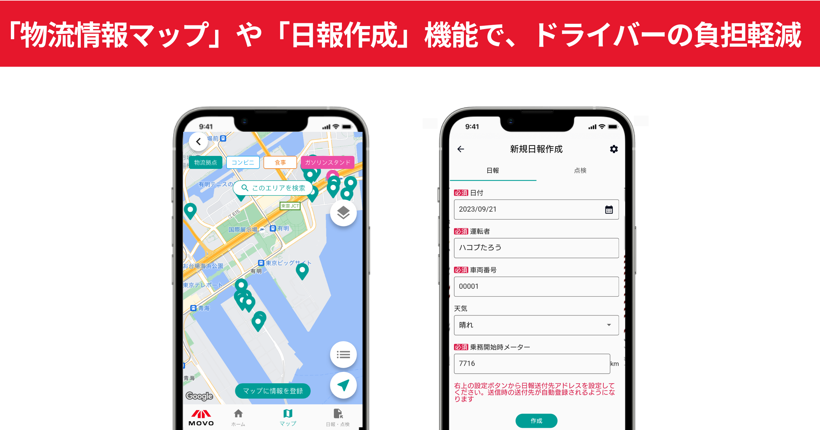 トラックドライバーの負担を軽減するため、Hacobuは2023年6月にスマホアプリ「MOVO Driver」の提供を開始しました。