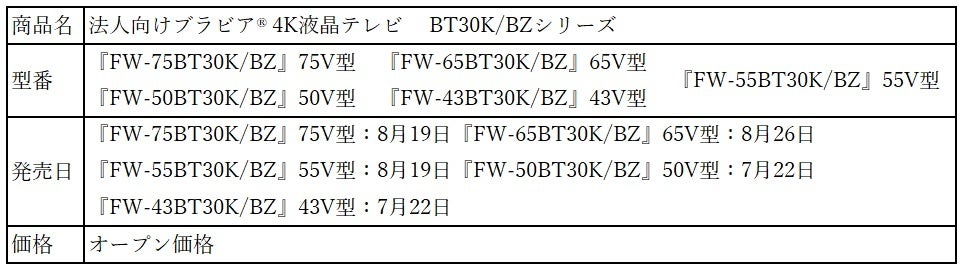 ソニーマーケティング株式会社(本社:東京都品川区、代表取締役社長:粂川滋、以下、ソニーマーケティング)は、法人向けブラビア4K液晶テレビ「BT30K/BZシリーズ」5機種を発売します。