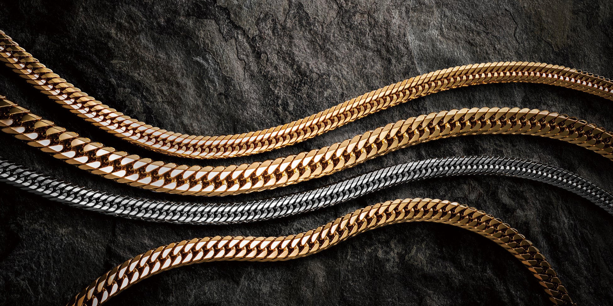 喜平のチェーンはシンプルな地金で構成された、重厚感と高級感を兼ね備えたデザインが特徴。