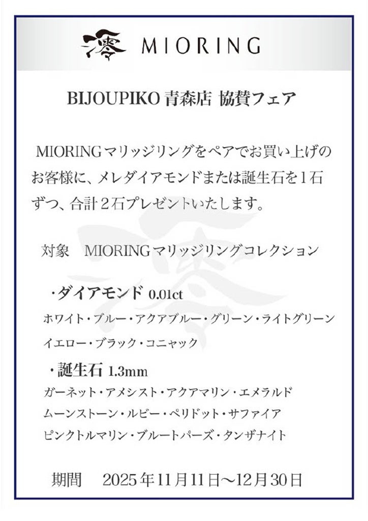 期間中ビジュピコ 青森店にて、MIORINGのマリッジリングをペアでご成約のお客様に、インサイドストーンのメレダイヤモンドまたは誕生石を1石ずつ、合計2石プレゼントいたします。