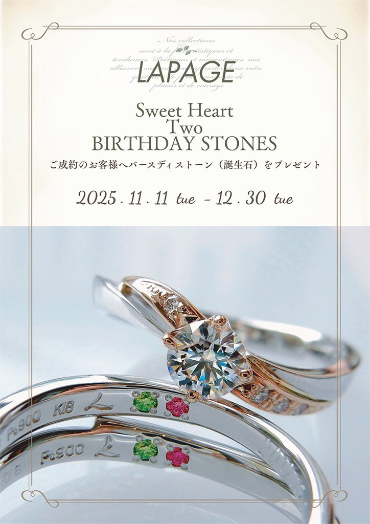 期間中ビジュピコ 青森店にて、LAPAGEのブライダルリングをご成約のお客様に、インサイドストーン(バースデーストーン)をプレゼントいたします。