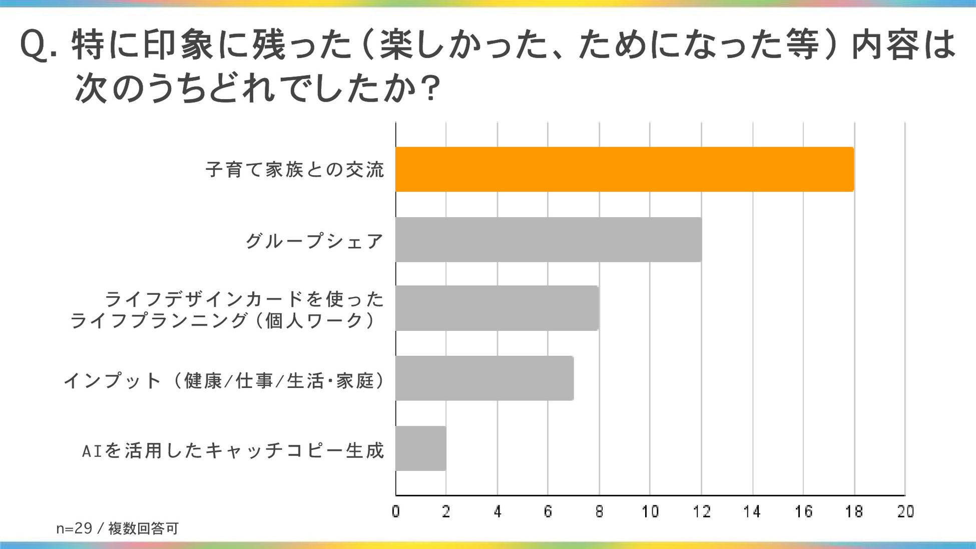 特に「子育て家庭との交流」が最も印象に残った内容として圧倒的に高い支持を得ており、実体験に基づいたリアルな声が、生徒のポジティブな意識変容に強く影響を与えたことがわかりました。