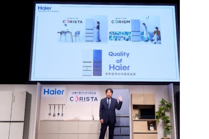 続いて、ハイアールジャパンセールス株式会社 商品企画部 原より新商品含めた3商品について順番にご紹介いただきました。ステージ上には、今回新発売される「CŌRISTA」「CŌRISM」含めた3商品が展示されており、2種類のムービー 動画なども活用しながら、それぞれのターゲットユーザーや商品特徴について紹介。
