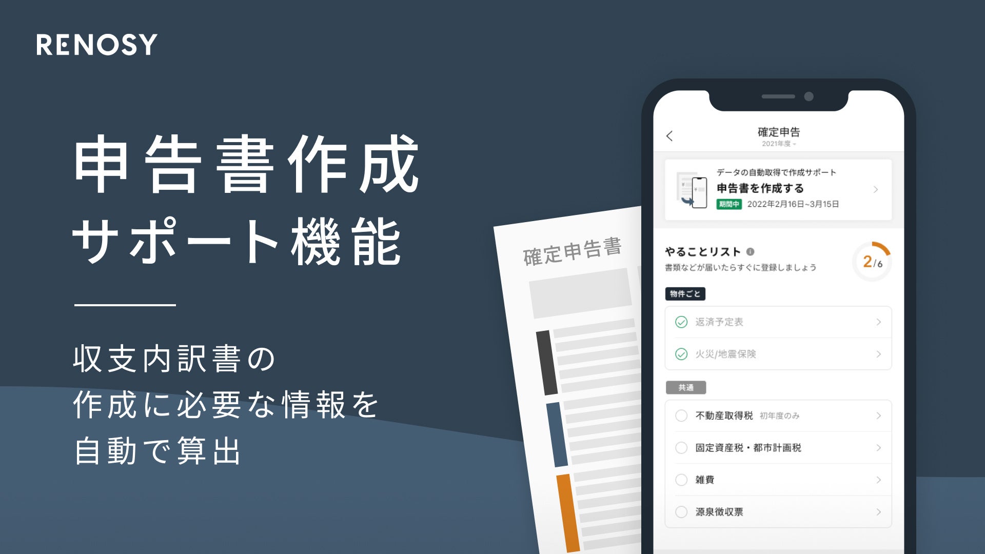 オンライン不動産取引マーケットプレイス「RENOSY(リノシー)」を運営する株式会社GA technologies(以下「当社」)は、RENOSYで物件を購入いただいたお客様向けに提供している資産管理アプリ「OWNR by RENOSY(オーナー バイ リノシー)」にて、収支内訳書の作成に必要な情報を自動で算出する「申告書作成サポート機能」の提供を開始しました(※1)。