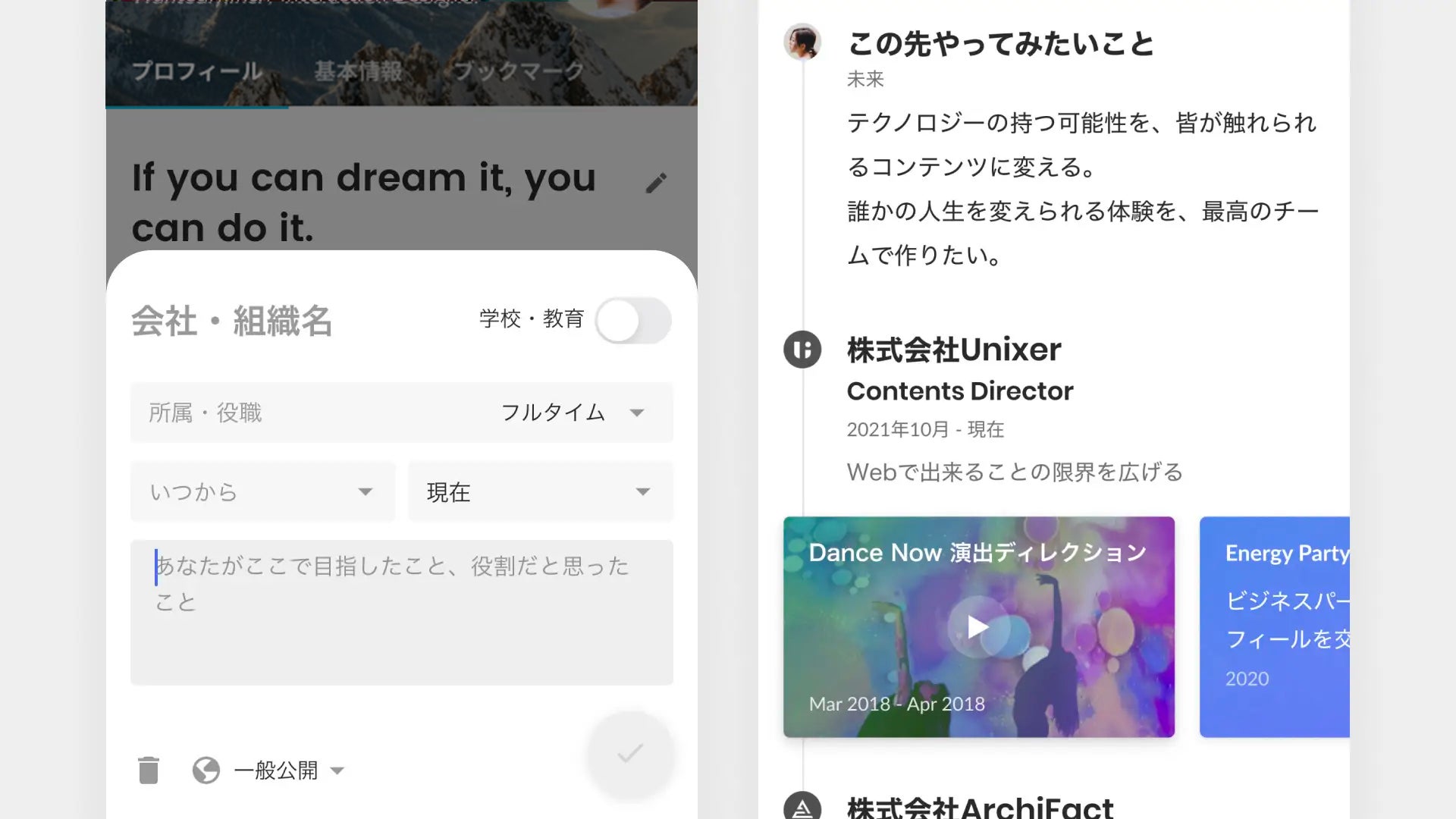 今回のプロフィール刷新は「想いと行動であなたを綴ろう」というコンセプトの元で行われており、仕事への「想い」を「あなたがここで目指したこと、役割だと思ったこと」欄で表せます。また、実際の「行動」を画像や動画を使ってカード形式で視覚的にリッチに、ポートフォリオサイトのように表現できます。