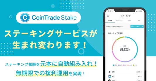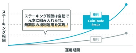 「CoinTrade Stake」においてサービス提供を行う、複利運用については、現在の「CoinTrade Stake」で提供している「ロック期間:90日」などの有期のプランとは異なり、「無期限・複利運用ステーキングサービス」を行うプランとなります。