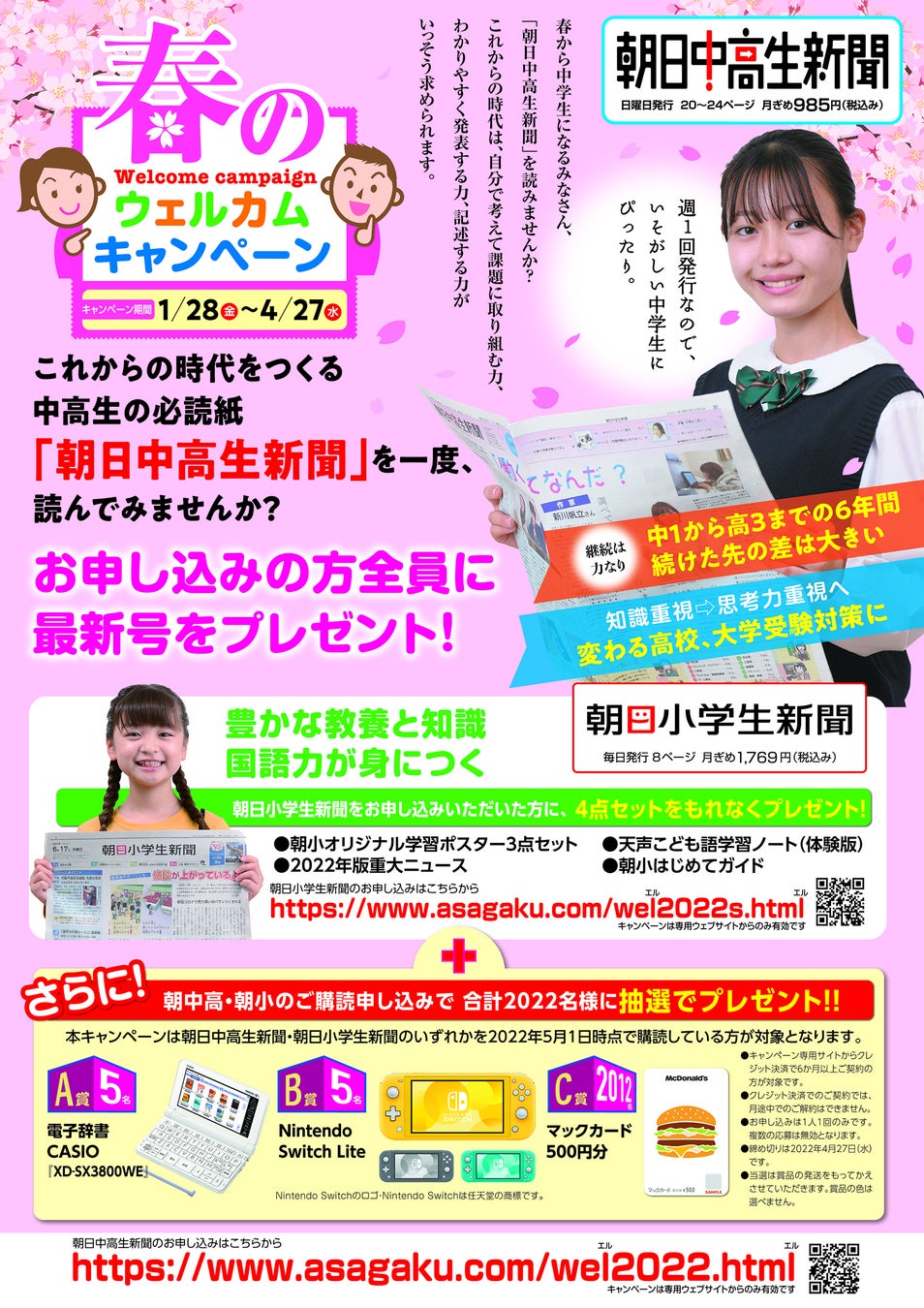 朝日小学生新聞、朝日中高生新聞が「春のウエルカムキャンペーン」を実施中 小中高生の「読む力」「考える力」アップを全力で応援!