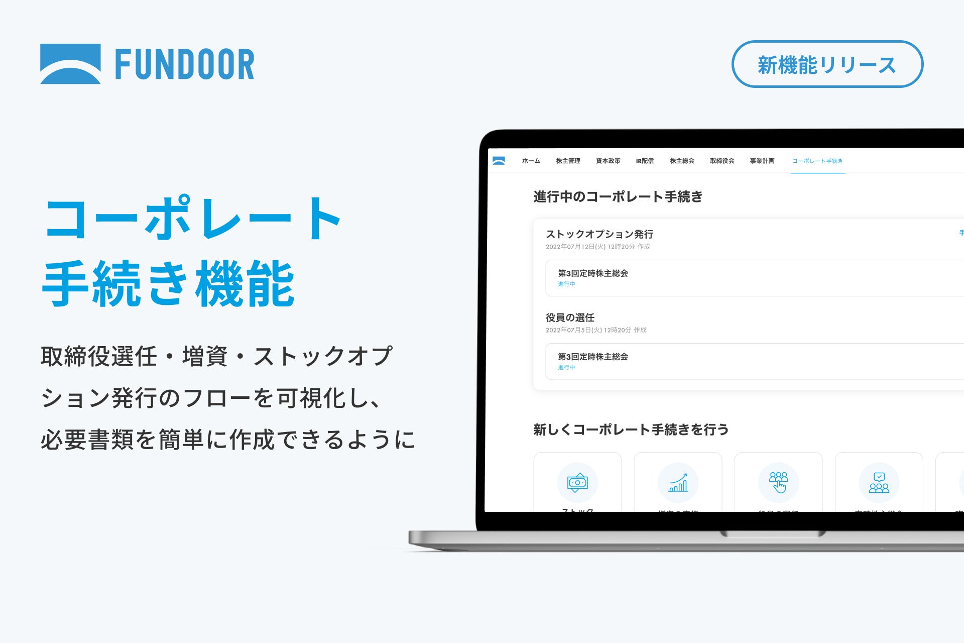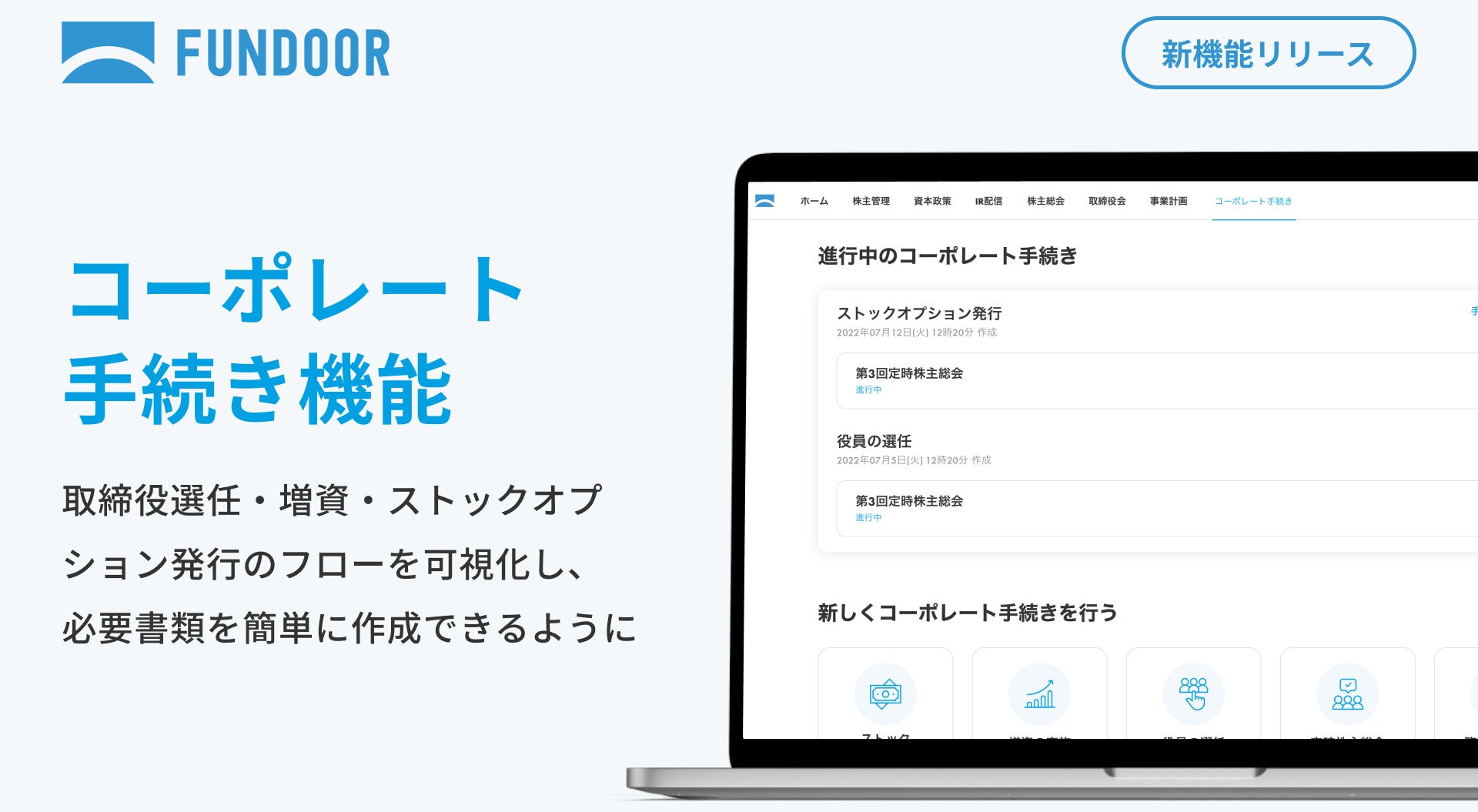 この度、FUNDOORでリリースした「コーポレート手続き機能」では、「取締役の選任手続き」、「増資手続き」、「ストックオプションの発行手続き」などの分かりづらい手続きをどなたでも簡単に実行することが可能です。