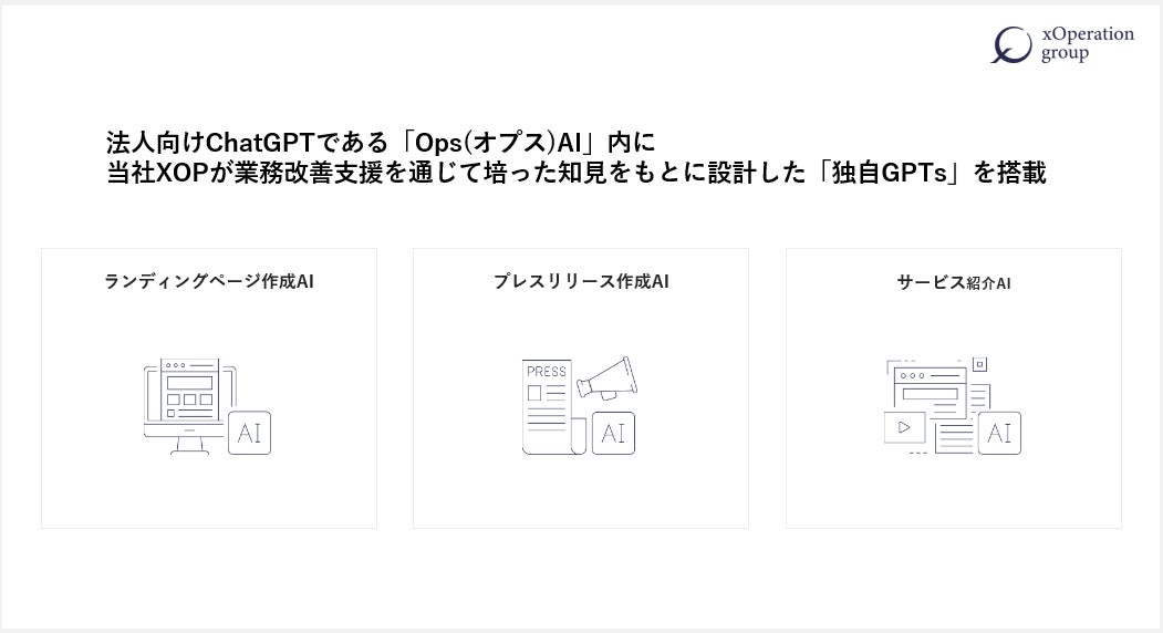 先端技術と業務(Ops)の融合に強みを持ち、生成AIを活用した業務改善支援を行う株式会社クロス・オペレーショングループ(東京都千代田区、代表取締役:田中亮大、以下XOP)は、自社で開発する法人向けChatGPT「OpsAI」(オプスAI)内に、独自プロンプトを搭載させたGPTsとして、【ランディングページ作成AI】【プレスリリース作成AI】【サービス紹介AI】の提供を開始したことをお知らせいたします。