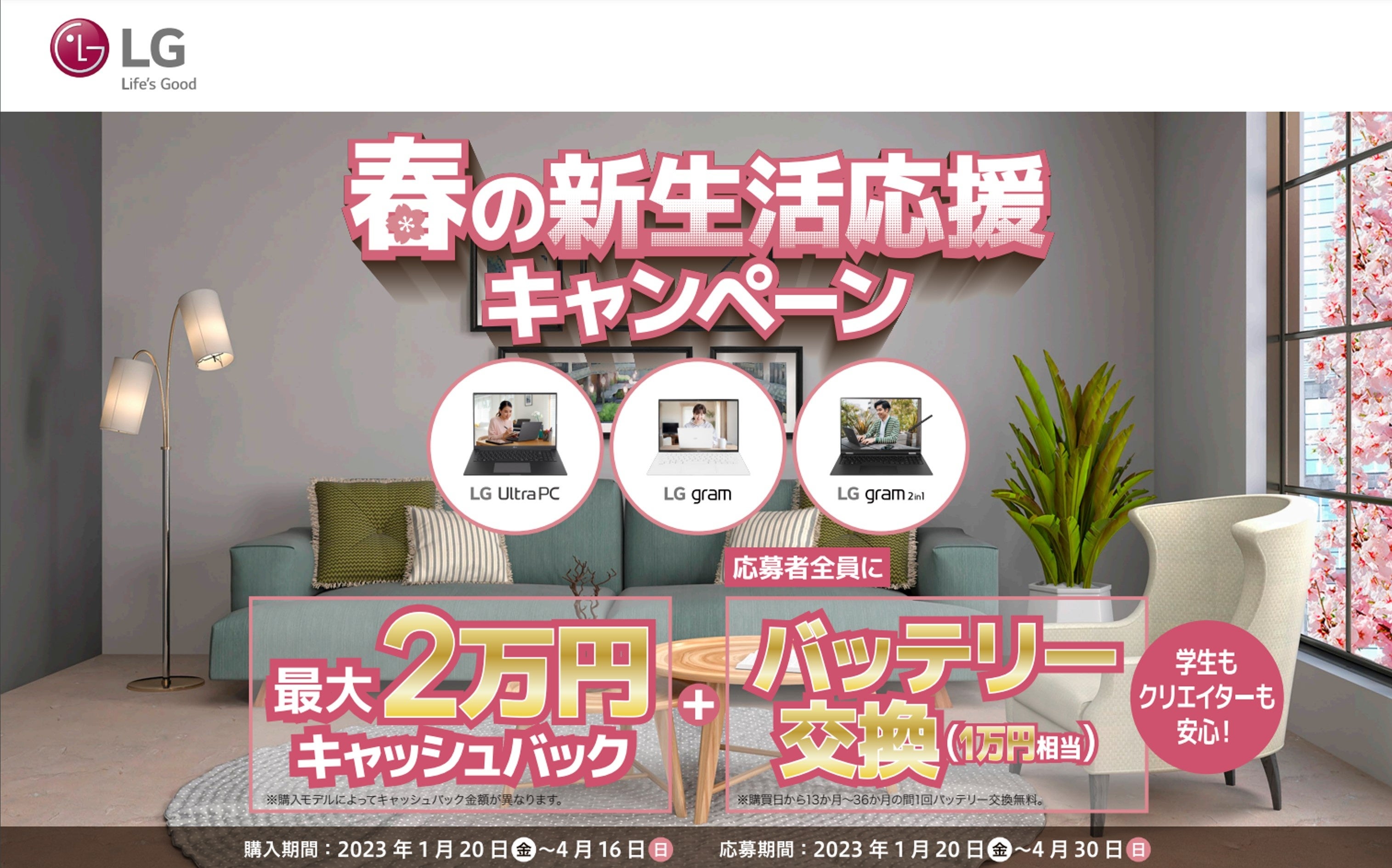 LGのモバイルノートパソコンを対象にバッテリー交換無料+最大2万円のキャッシュバック!『春の新生活応援キャンペーン』を実施 応募期間:4月30日(日)まで