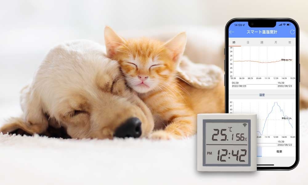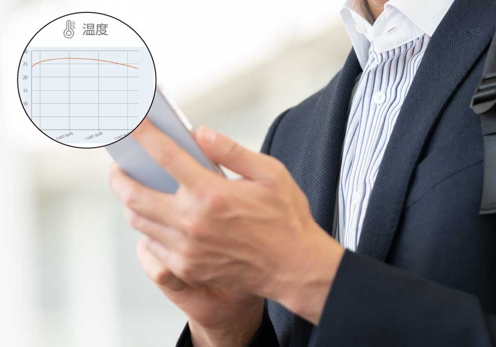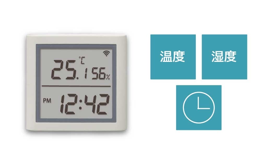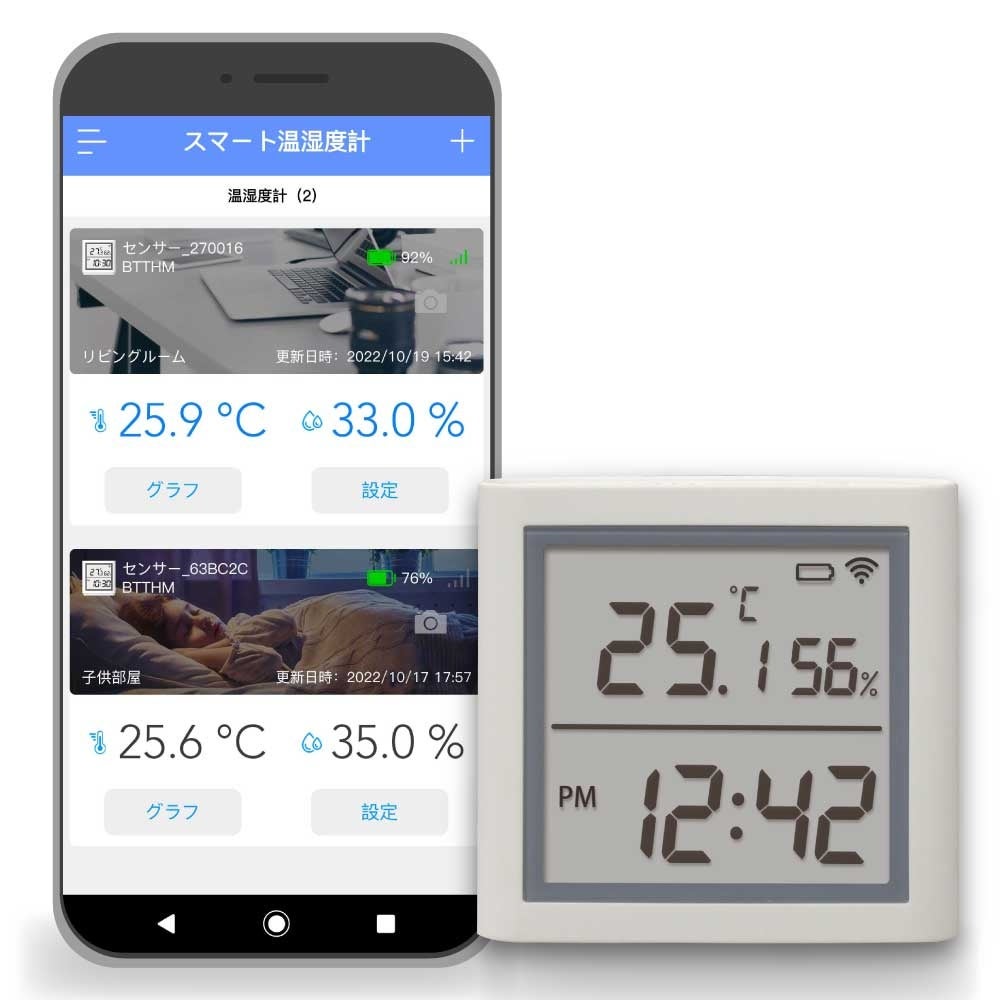 液晶画面には「温度」「湿度」「時刻」を大きく表示し、部屋の状態をリアルタイムで把握。計測した数値は10分単位で自動保存され、専用スマホアプリから数値やグラフを確認することができます。