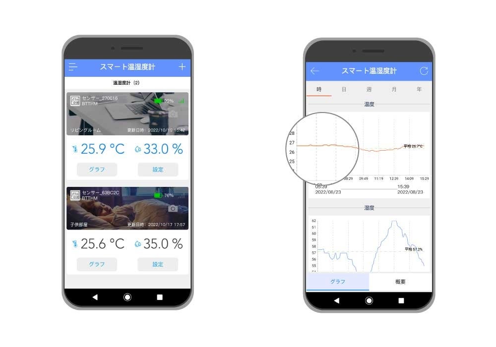 アプリのホーム画面には、設置した温湿度計の計測値を一覧表示。グラフ画面を開けば、数値の変化がひとめで分かります。