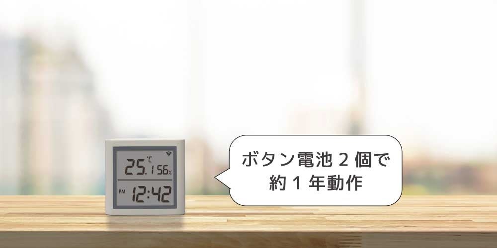 面倒な配線は不要で、測りたい場所に設置するだけ。ボタン電池(CR2032)2個で約1年動作します。