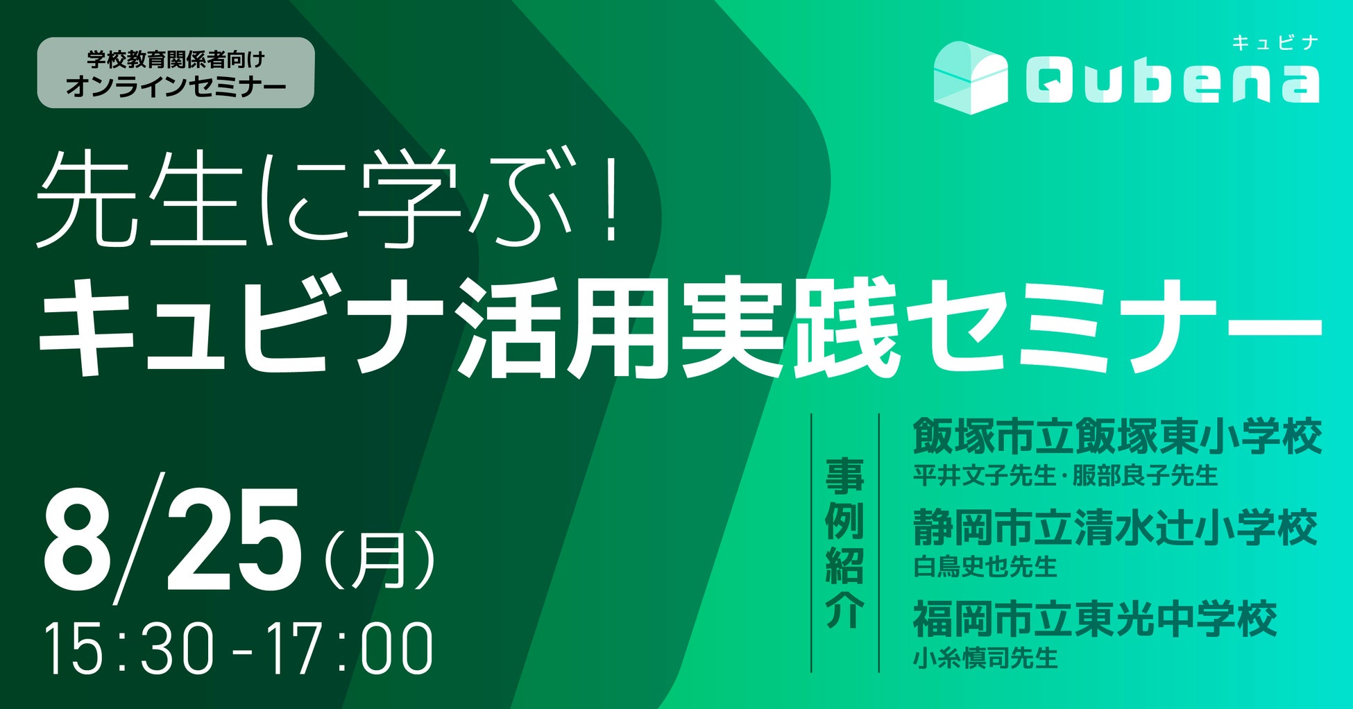 学習eポータル+AI型教材「キュビナ」を開発・提供する株式会社COMPASS(本社:東京都文京区、代表取締役:佐藤潤、以下 COMPASS)は、全国の自治体および学校関係者を対象に、現場で日々キュビナを活用されている小学校・中学校の先生方にご登壇いただき、学校全体での活用推進の工夫、自由進度学習の取り組み、学習データの活用といった「キュビナを活用した個別最適な学びの実践事例」を共有するオンラインセミナーを2025年8月25日(月)に開催することをご報告いたします。