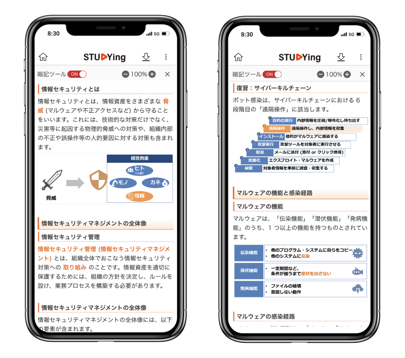 情報セキュリティマネジメント試験では、セキュリティ知識と幅広い関連知識がメインに問われます。情報セキュリティの初学者にとっては、用語のイメージが湧きにくく、対策に苦慮しているという受験者の声が複数寄せられています。 そこで、スタディングでは「図解」や「イラスト」を多用した動画講義により、専門書籍を精読するような学習よりも、より短期間で容易に専門知識を理解できることを目指しました。また、AI問題復習機能を搭載し、個人別に最適なタイミングで復習問題を出題することにより、効率的な苦手分野の対策ができます。そのため、忙しい社会人の方もオンラインでスマホを活用してスキマ時間ですべての試験対策が可能となります。