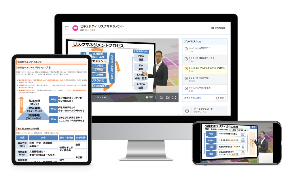 情報セキュリティマネジメント講座の目的は、試験で満点を取ることではなく、合格点を取得し、且つ資格取得後に「使える知識」として身につけることです。講座で扱う内容は、繰り返し出題されている論点を中心とし、カリキュラムの内容を凝縮するとともに、図解によってイメージしやすく、効率的に学習できるようにいたしました。