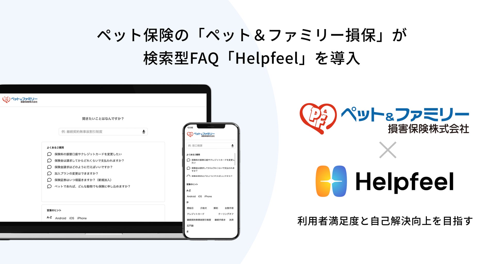 株式会社Helpfeel(京都府京都市 代表取締役/CEO:洛西 一周 以下、当社)はこのたび、T&D保険グループのペット&ファミリー損害保険株式会社(東京都台東区 代表取締役社長:三瓶 雅央 以下、ペット&ファミリー損保)が運営するペット保険サービスのカスタマーサポートツールとして、ユーザーのどんな質問にも答える検索型FAQ「Helpfeel(ヘルプフィール)」(https://helpfeel.com/)を導入いただいたことをお知らせいたします。