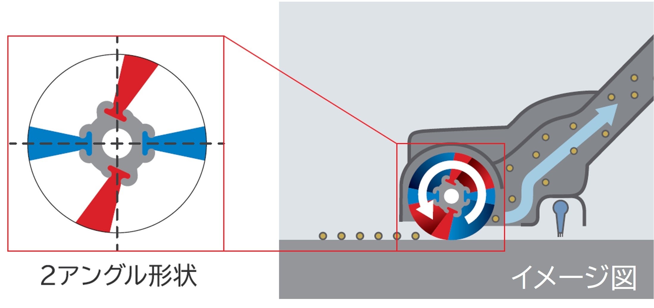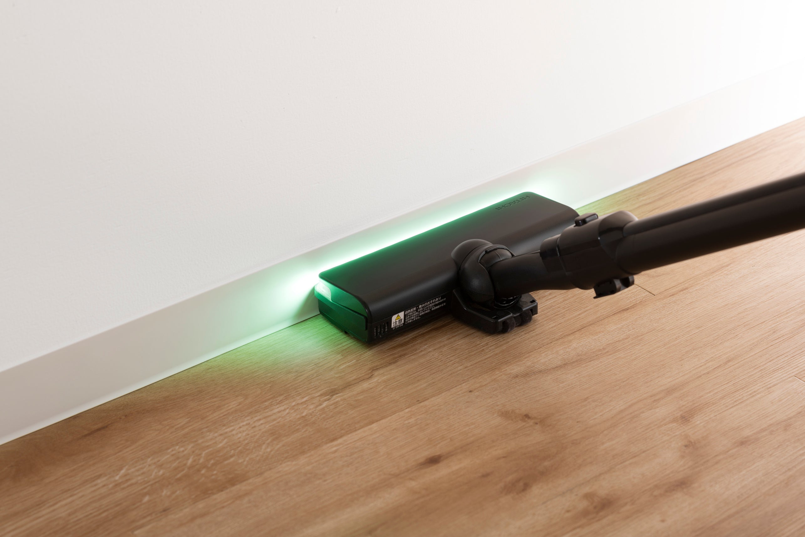 本製品では、ヘッドに「パワフル スマートヘッド plus」を新たに採用しました。同ヘッドに搭載している「3方向ごみくっきりライト」は、緑色と白色を含むLEDライトで前だけでなく左右も照らし、広い範囲の見えにくいごみを浮かび上がらせます。普段の床掃除では広い範囲を照らし、ヘッド前部が壁についた状態でも左右のごみを見つけやすくなります。また、前後だけでなく左右からも吸引できる「4方向吸引機構」を採用しました。前方や後方に加え、今回新たに設けた左右の流路から、横方向のごみを吸引するため、壁ぎわのごみも吸い込みます。