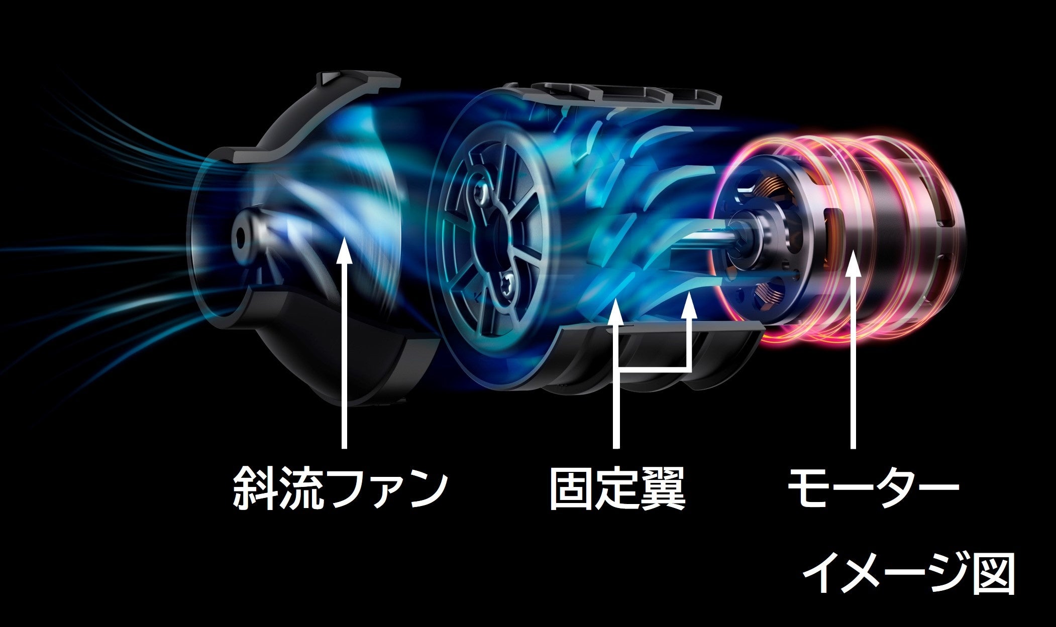 本製品では、小型軽量の「パワフル3Dファンモーター」を搭載しました。モーターには高効率の「極異方4極マグネット」を採用し、三次元斜流ファンと固定翼により空気の流れを効率よく制御し、強烈パワーを実現しました。標準質量(*4)1.6kgの軽量でありながら、じゅうたんの奥のごみまでしっかり吸引します。