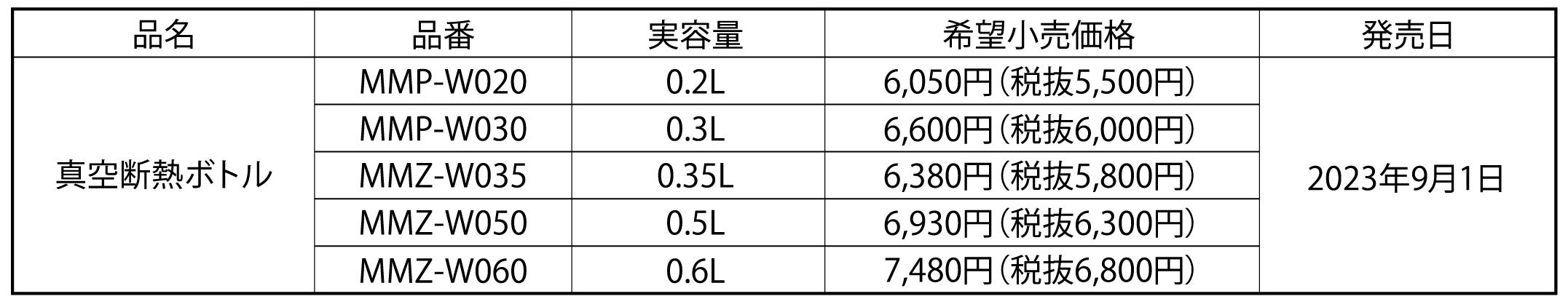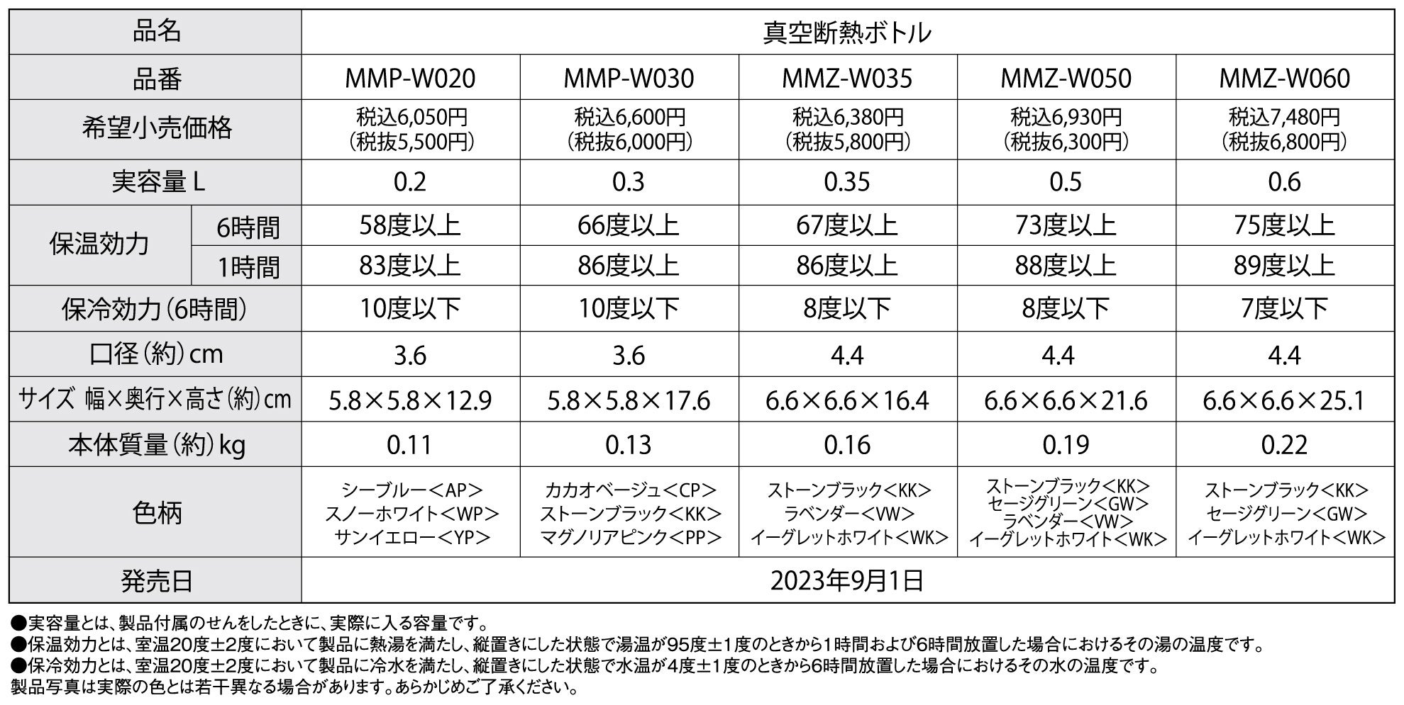真空断熱ボトル MMP-W020/W030、MMZ-W035/W050/W060 2023年9月1日発売