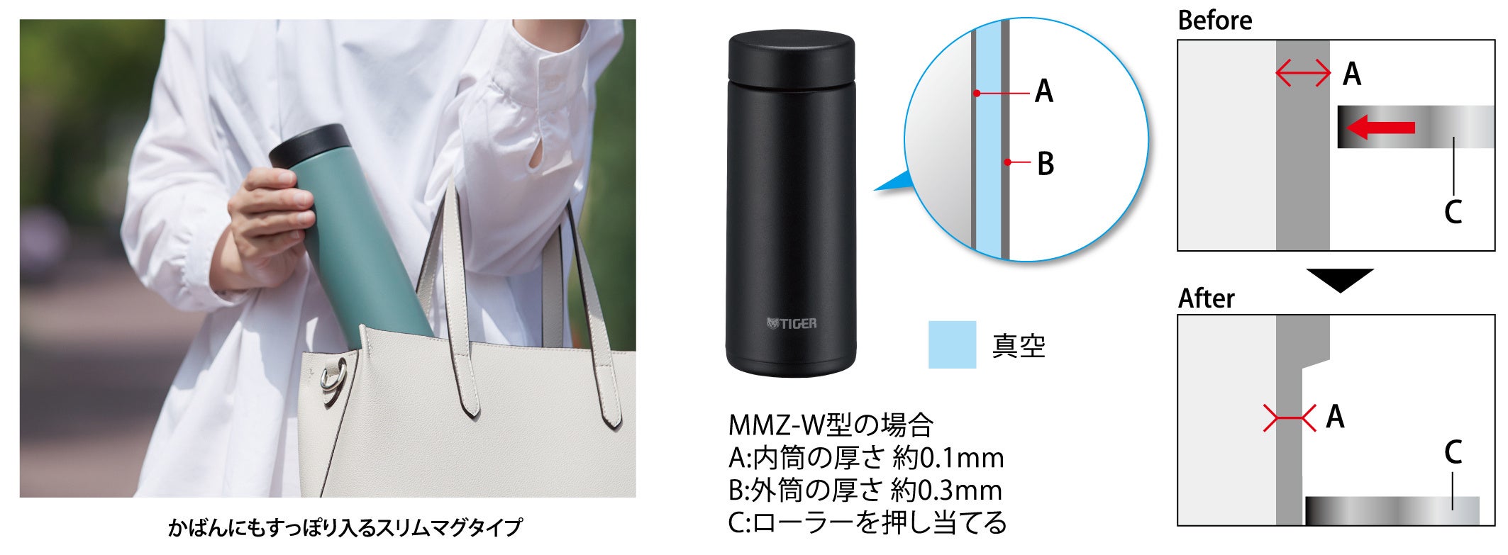 当社独自のスピニング加工により、内筒を極限まで薄く加工し、軽量化を実現。MMZ-W035(0.35L)は約160g、MMP-W020(0.2L)は約110gの軽さで、持ち運びに最適です。