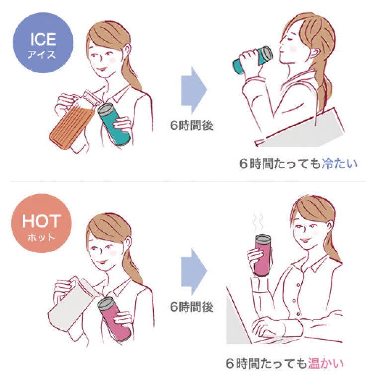 冷たい飲み物は冷たいまま、温かい飲み物は温かいまま、飲みごろの温度を6時間以上キープします。