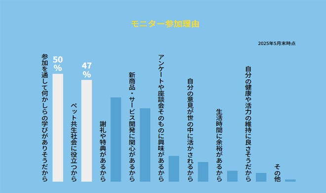 『ani voice』のモニター様は、ペットとの生活に高い意識と関心を持つ層が中心です。主な参加理由として「参加を通して何かしらの学びがありそうだから(50%)」「ペット共生に役立つから(47%)」といった声が寄せられています(※4)。