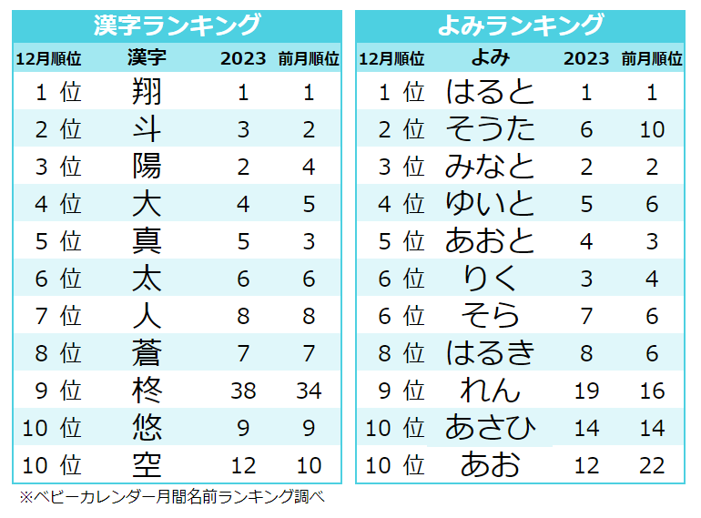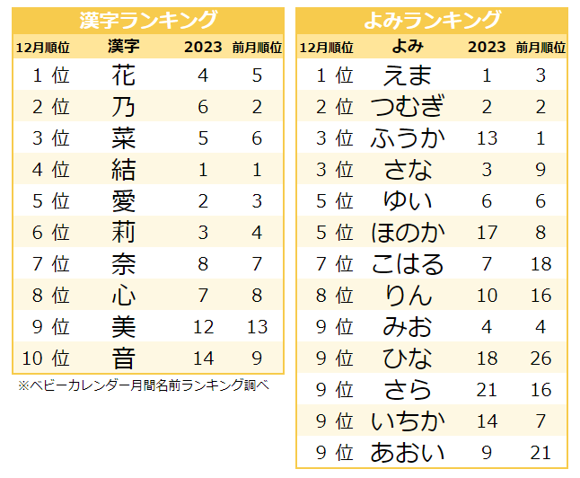 12月のよみランキングTOP3は、1位「えま」、2位「つむぎ」、3位「ふうか」・「さな」となり、11月TOP3と同じよみが揃いました。12月に大きく順位を上げTOP10入りした「こはる」は、10月22位、11月18位、12月は7位へと寒さが厳しくなるにつれ、多く名付けられる傾向に。「こはる」から連想される「小春日和」という言葉は、晩秋から初冬の時期の穏やかな晴天を指し、特に冬の時期に多く名づけられているようです。