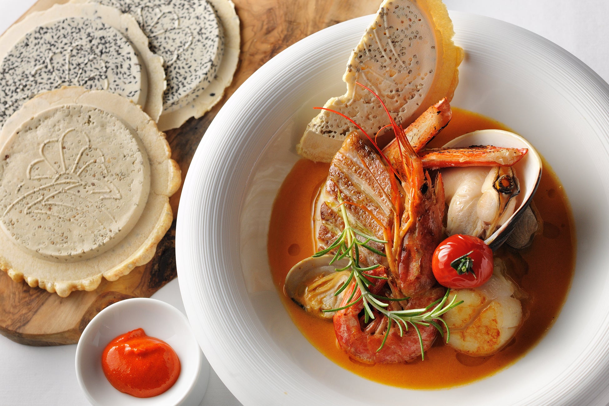 太平洋、日本海、陸奥湾と、三方を海に囲まれた青森県だからこそ、多種多様な魚介を仕入れることができます。冬の旬を迎えるさまざまな海の幸をふんだんに使用した、あつあつのブイヤベースを用意しました。一口すくうと、舌の上に魚介のふくよかな香りと旨味が広がります。ブイヤベースに合わせて楽しめるのは、青森県で広く親しまれる南部せんべいと、ニンニクをたっぷり使用したアイヨリソースです。青森らしい特別な朝食を味わう、贅沢な時間を堪能できます。