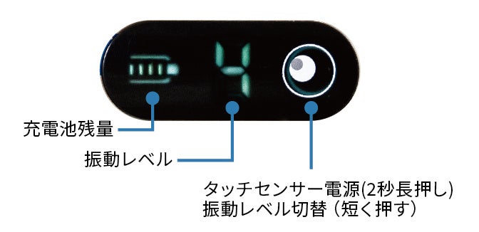 操作はタッチセンサーで、電源オンオフと振動レベルの切替が簡単に操作できます。シンプルで直感的に使いやすいデザインです。