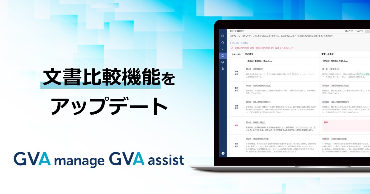 GVA TECH株式会社(本社:東京都渋谷区、代表取締役:山本 俊、以下GVA TECH)は、マターマネジメントシステム「GVA manage」とAI契約書レビュー支援クラウド「GVA assist」の、新旧文書比較機能をアップデートしたことをお知らせします。今回のアップデートにより、2つの文書をより直感的に比較できるようになります。