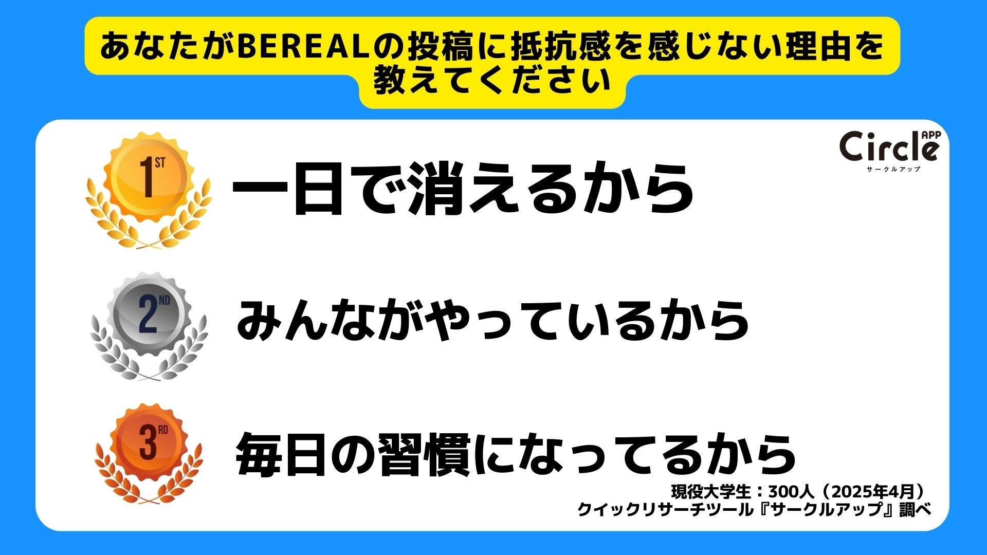 BeRealは内外カメラ両方の発信を強制され、投稿のタイミングも選びづらいなど、一見抵抗感を感じやすそうなサービス内容をしています。ではなぜここまで抵抗感を感じる学生の割合が低いのでしょうか。