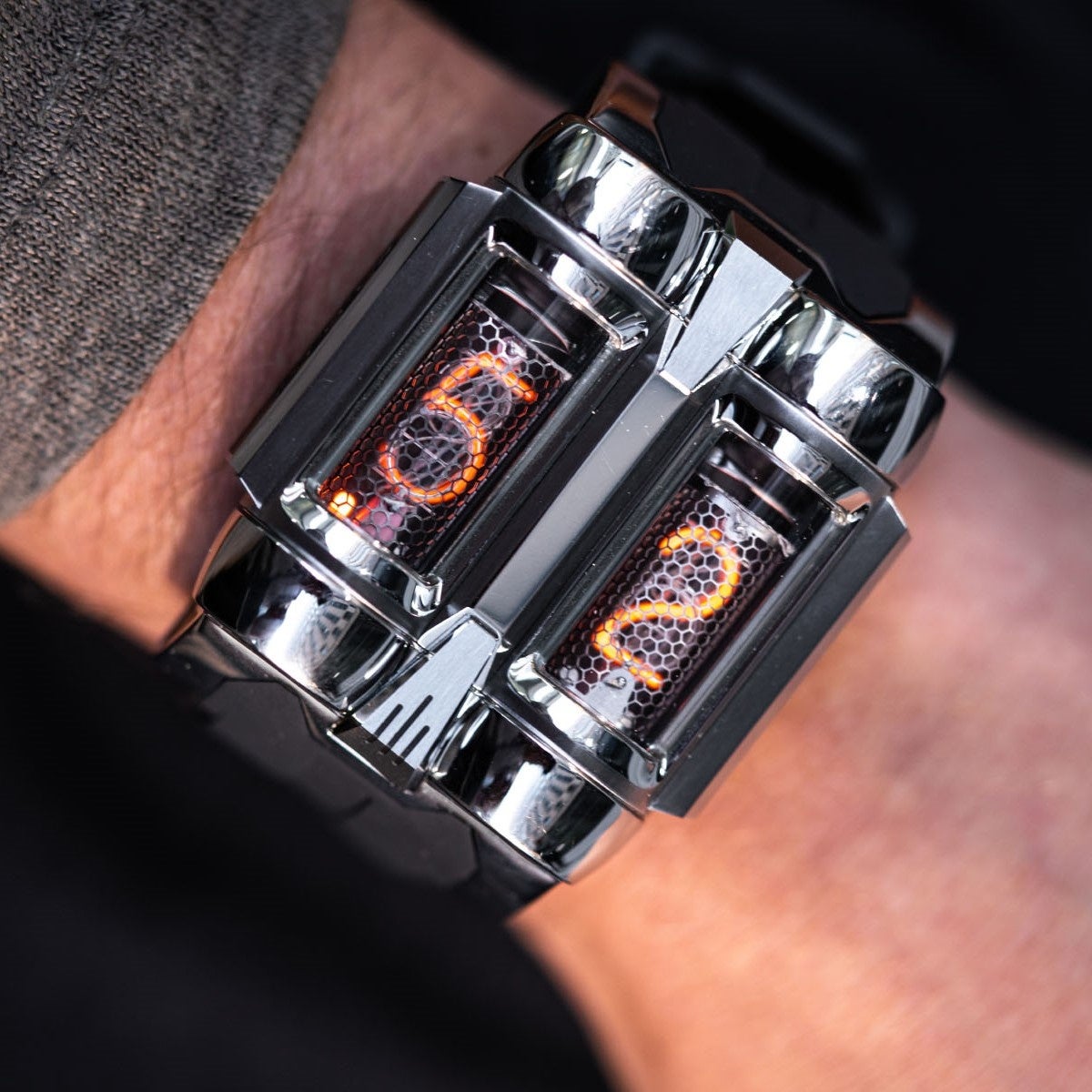 腕時計のコンパクトな魅⼒を引き⽴てるために、2つのNixie管を使⽤し、独⾃のスタイリッシュな時間表⽰を実現しています。