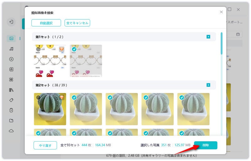 手順2:「類似画像を削除」をクリックすると、類似画像の検索が始まります。スキャンが終わってから、類似画像の検索結果が自動的に出てきます。問題がなければ、「削除」をクリックします。